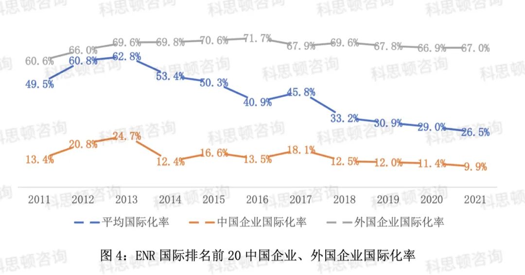 本文统计了自2011-2021年排名前20的企业的国际化率的数据,将数据分为平均值、国内企业、国外企业三类。十年来,“中国企业”的国际化率呈现下降趋势,从2011年的13.4%,及至2013年上升到最高点24.7%,至此一路下滑,直至2021年的9.9%;而同期全球最大国际承包商排名前20的“外国企业”的国际化率基本稳定在60%-70%的区间范围内。当然,中国企业的一个显著特点是业务体量上来了,这也导致了全球最大国际承包商排名前20家的平均线一路下滑,也就是说中国企业拉低了平均线。
