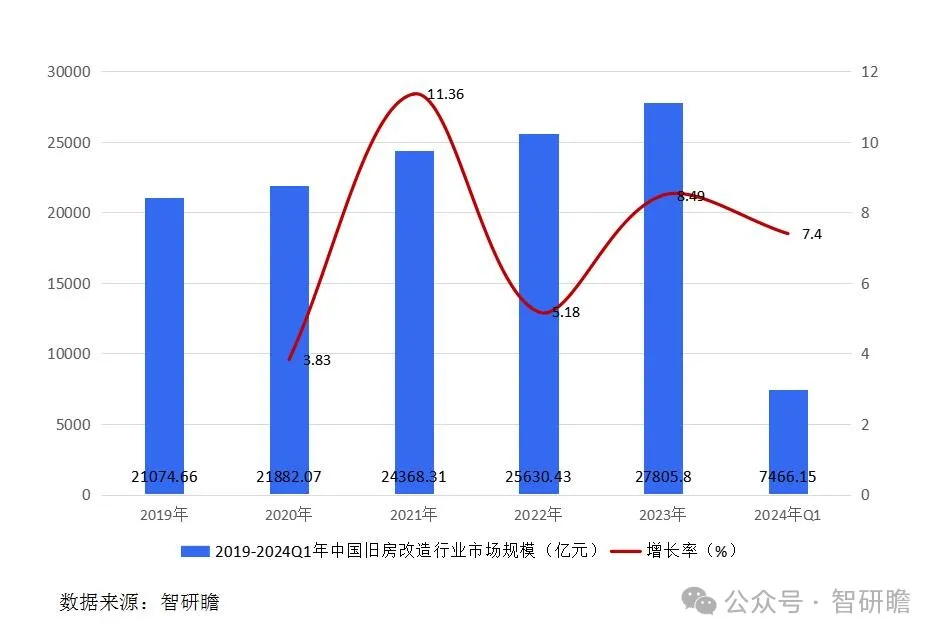 图表:2019-2024Q1年中国旧房改造行业市场规模