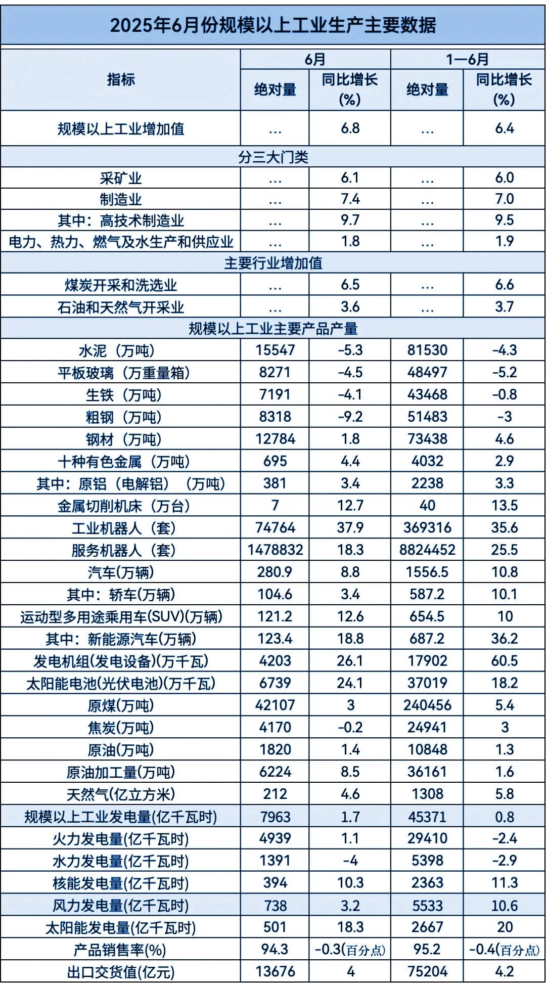 ?掌上风电消息,国家统计局发布《2025年6月份能源生产情况》和《2025年6月份规模以上工业增加值增长6.8%》。