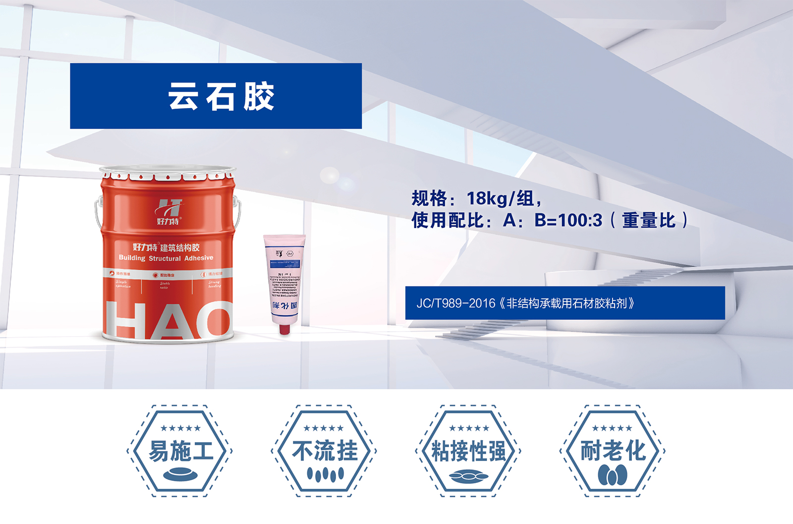 产品主要原材料为改性树脂,适用于石材的粘贴、快速定位、拼花等施工。