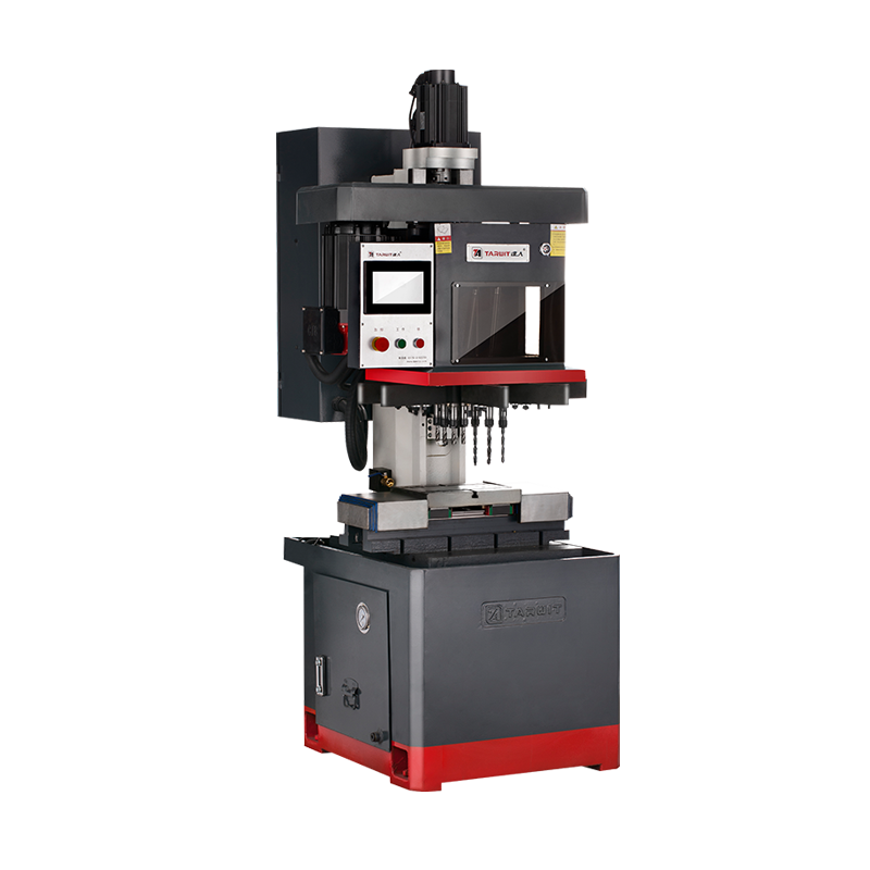 通过可移动工作台,两工位联动,一次装夹,钻孔、攻丝一次完成。